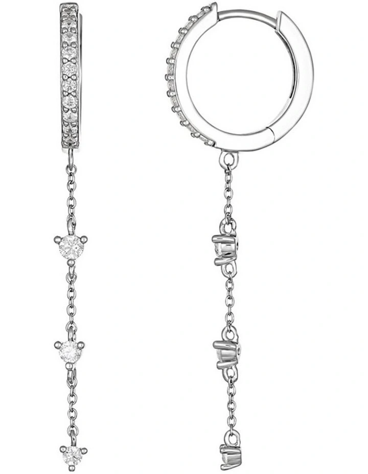 Chain is one of the hottest trends in Jewellery this season. The Loved earrings combine a ten stone set English lock hoop with a shining chain to create an earring that moves beautifully. The chain drop features three sparkling claw set stones that sparkle with every step you take. Crafted from 925 Sterling Silver and Rhodium plated they measure approximately 40.53mm.