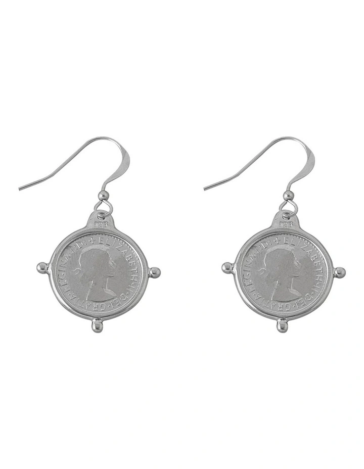 Additions to Von Treskows iconic coin collections, the compass frame earrings feature authentic Australian threepence coins encased in sterling silver. The frame features detail at North, South, East & West.