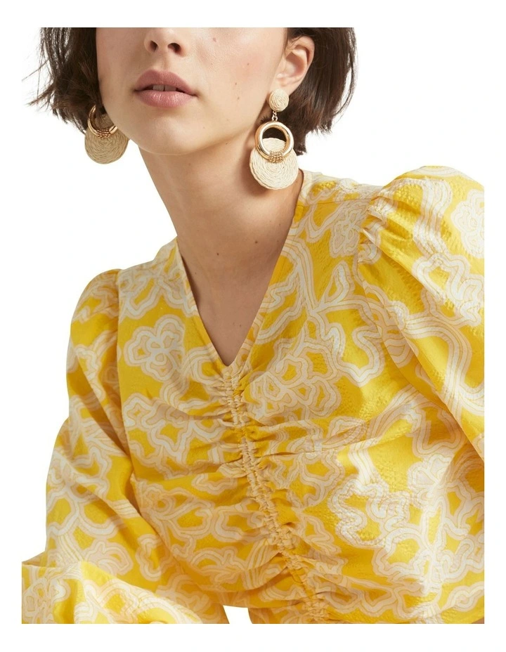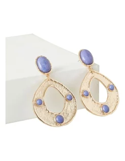These earrings feature woven rounds and thick gold-look loops, layered in a tiered design. They fit through the ear with a stud backing.