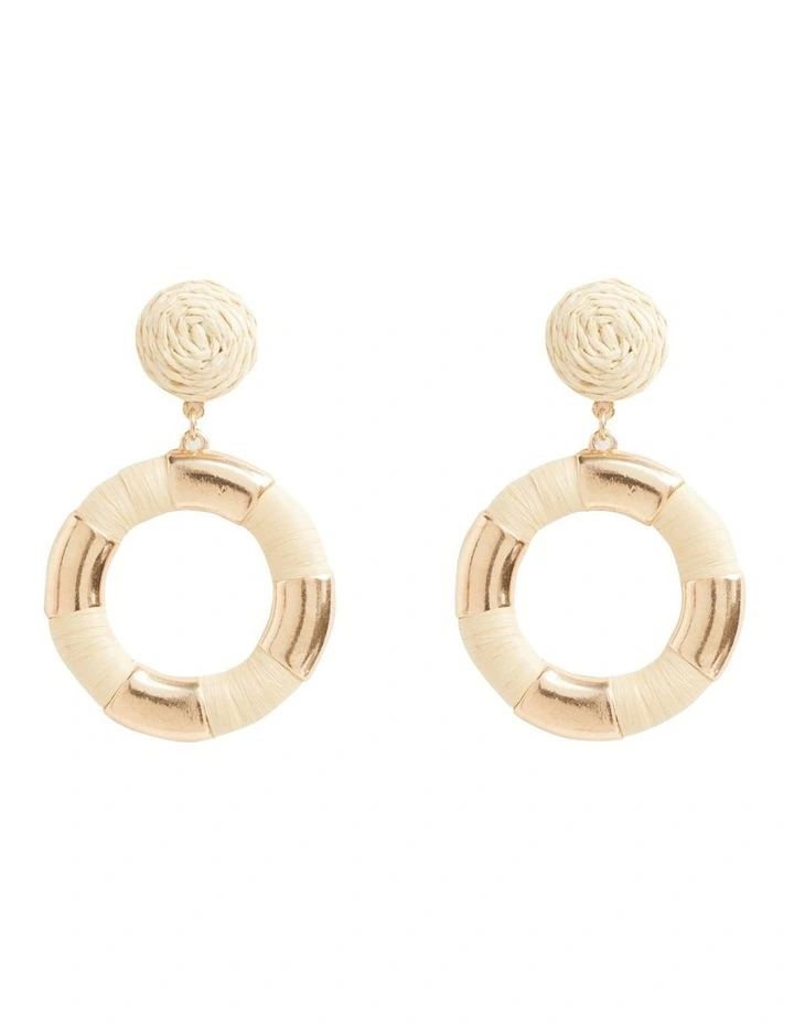 These earrings feature a round raffia stud and a hanging loop with wrapped details. They are crafted from a gold-look metal alloy and have a stud backing.